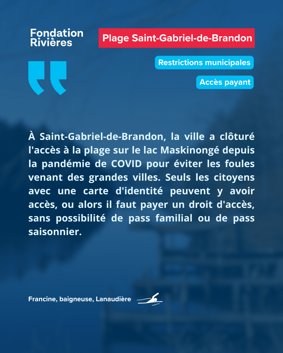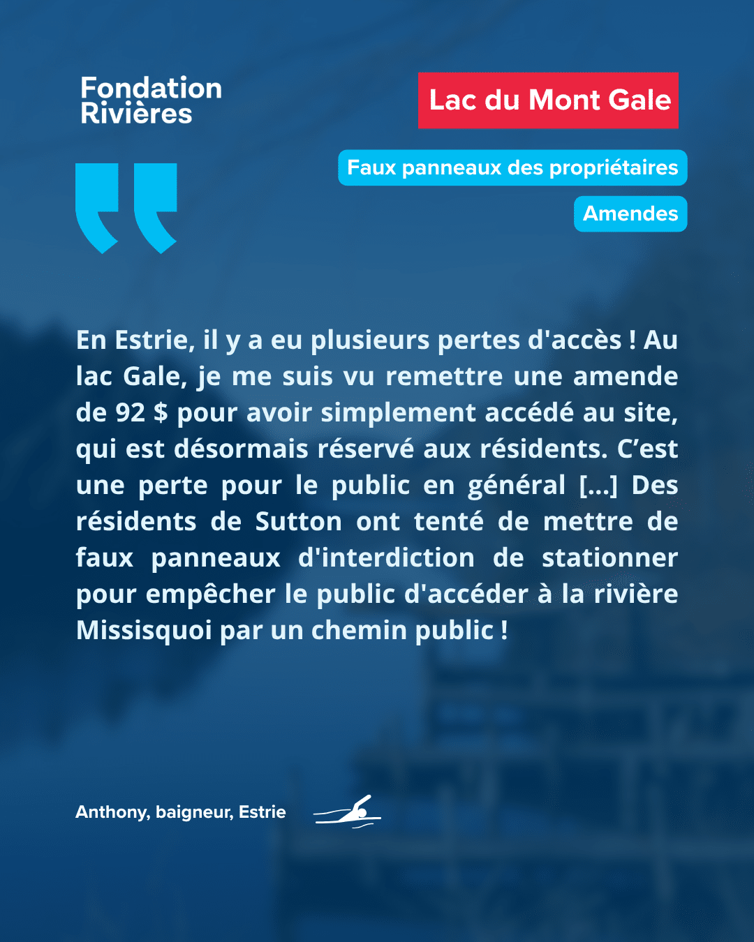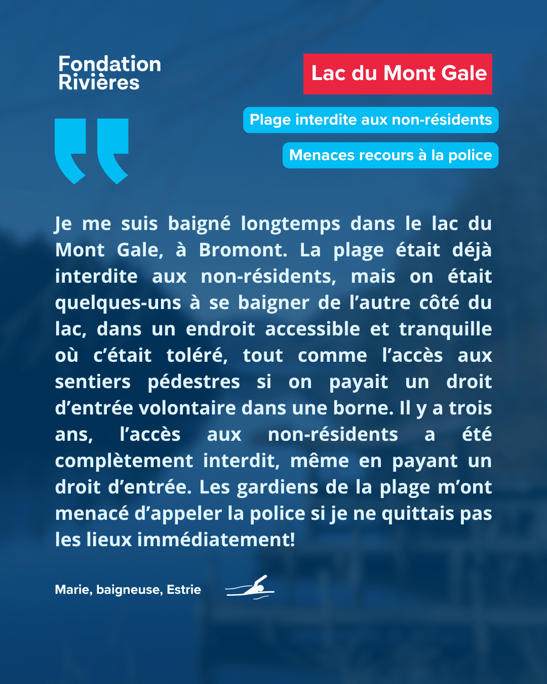 « J’allais pendant plusieurs années me baigner au lac du Mont Gale, à Bromont. La plage était déjà interdite aux non résidents, alors quelques personnes se baignaient de l’autre côté du lac, dans un endroit accessible et tranquille et c’était toléré [...]. Il y a trois ans, l’accès aux non-résidents a été complètement interdit, même en payant un droit d’entrée. Les gardiens de la plage m’ont menacé d’appeler la police si je ne quittais pas les lieux immédiatement ! »