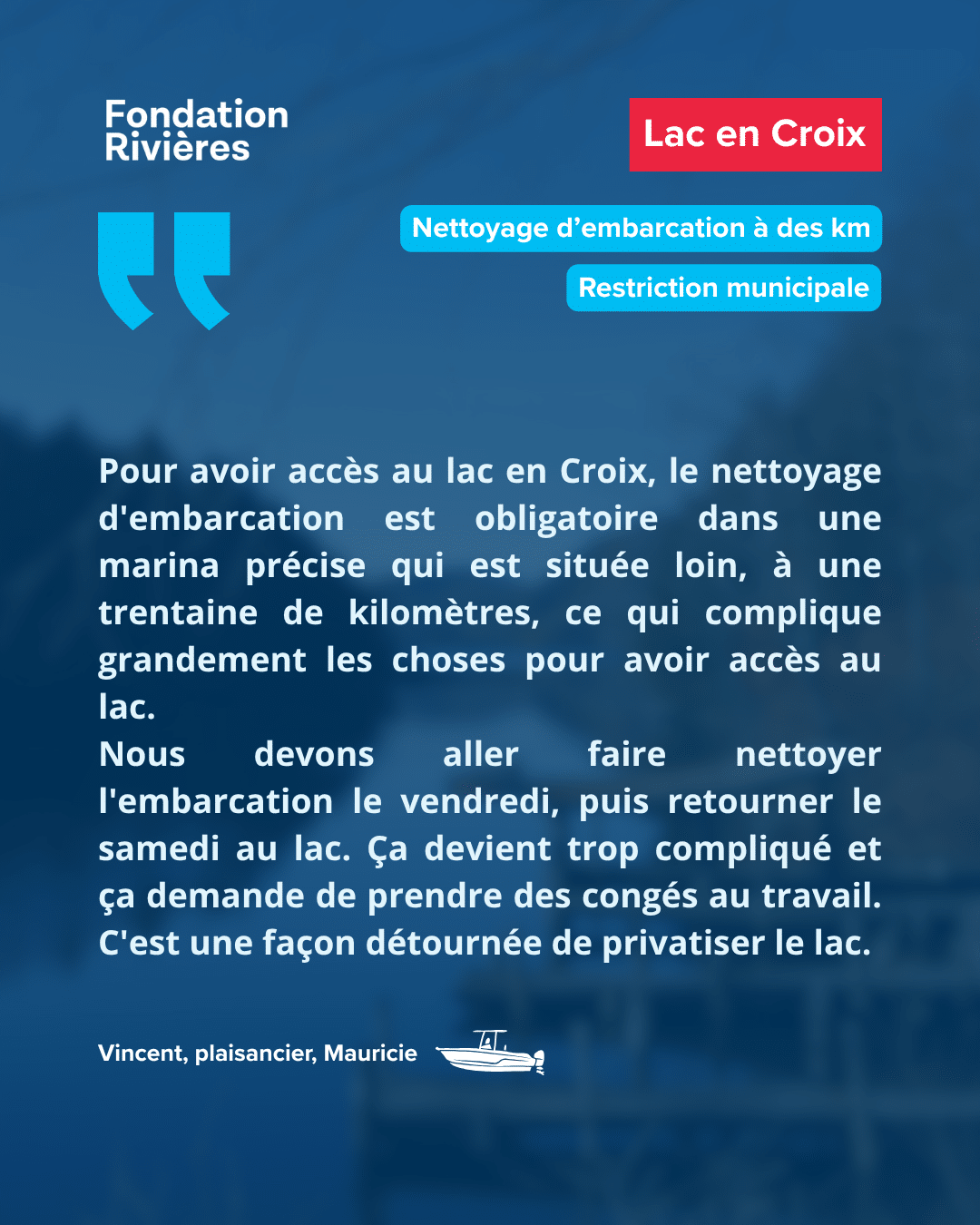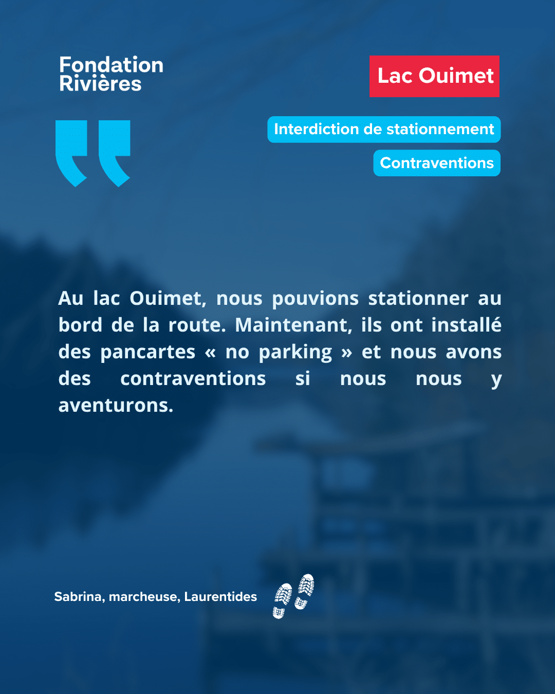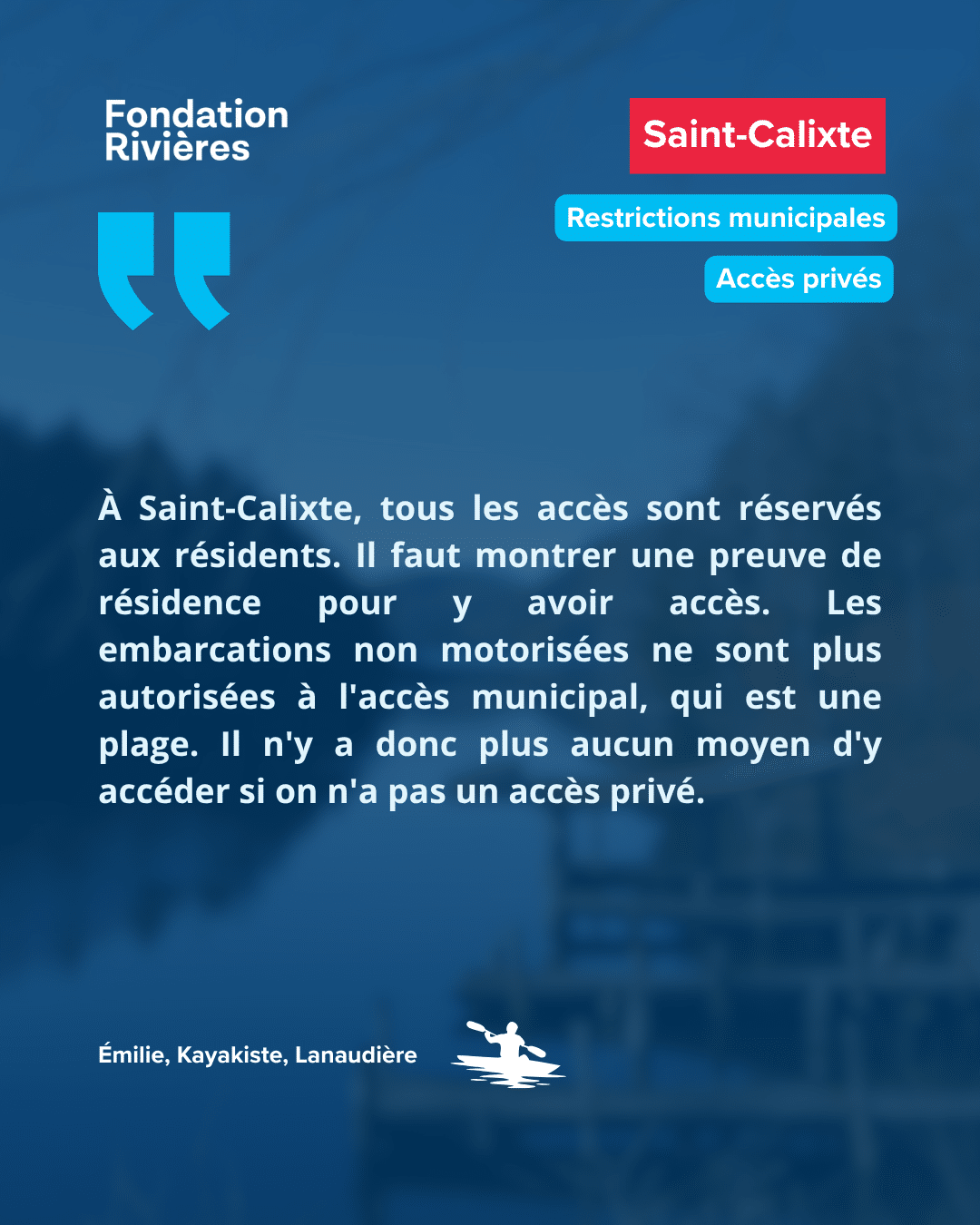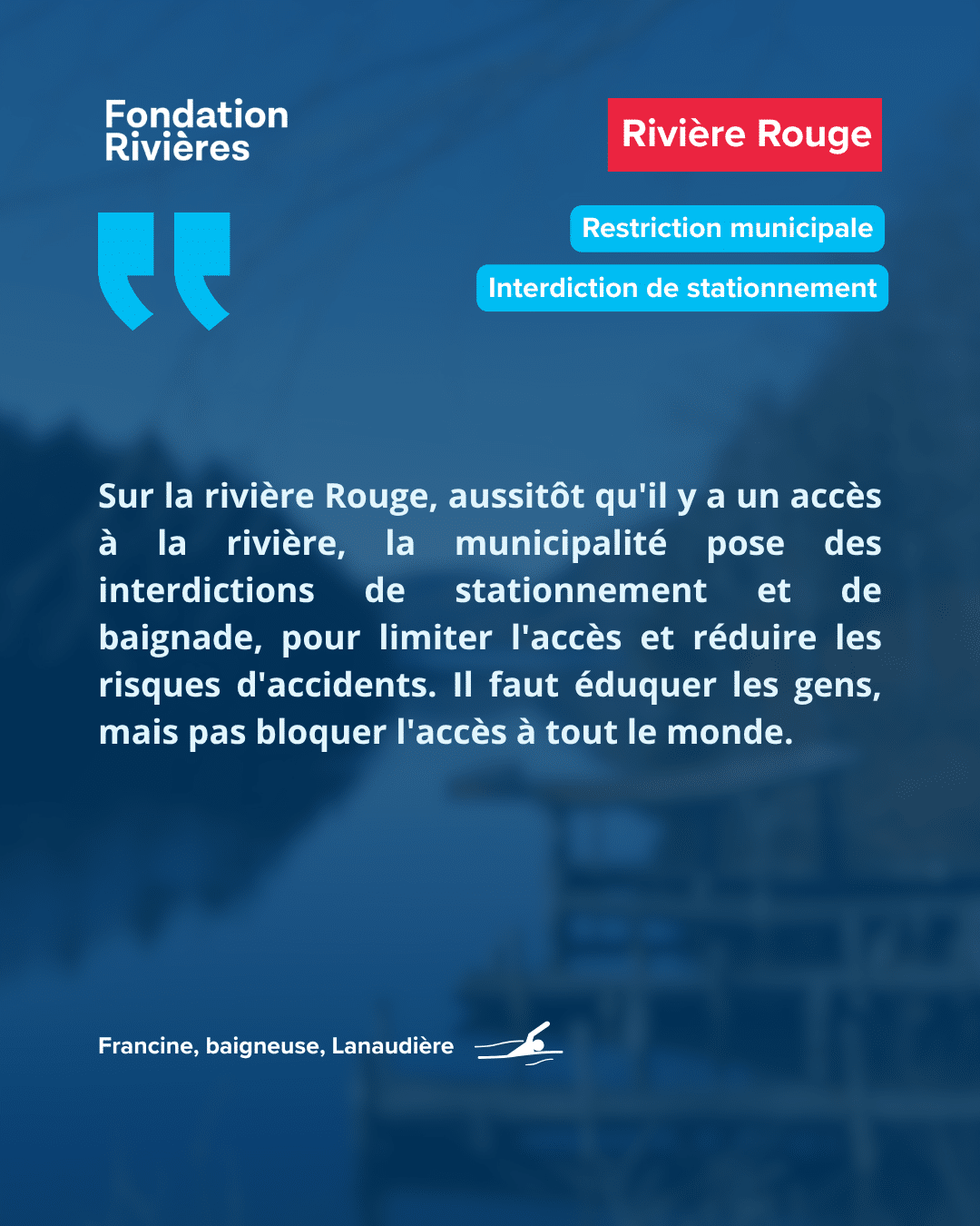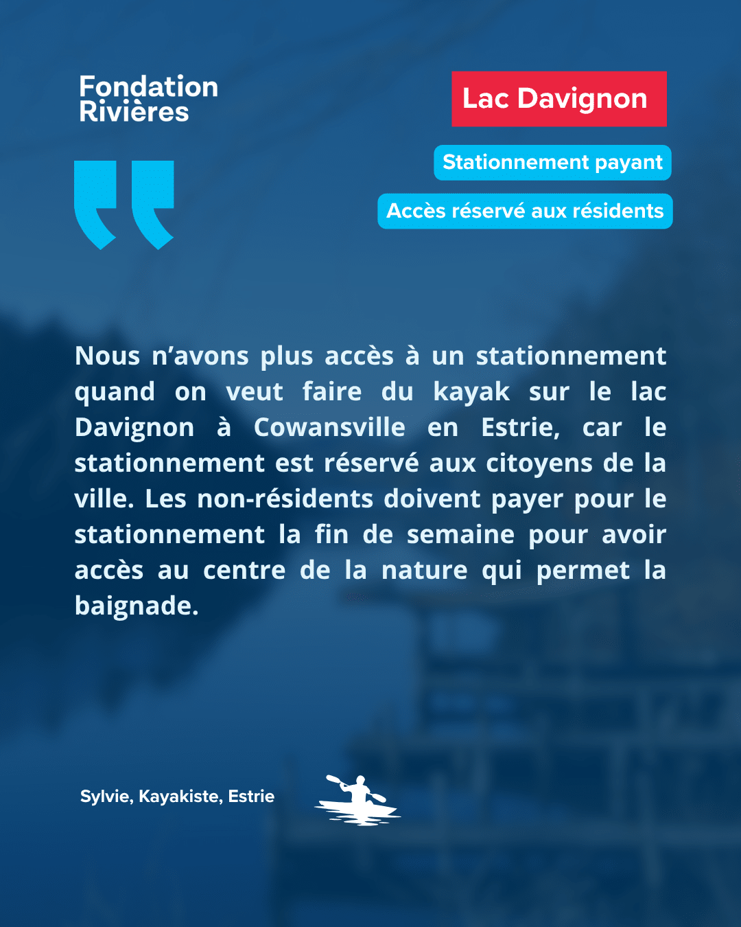 Ces récits montrent que l’accès légal ne garantit pas l’accès réel pour toutes et tous — et que même des accès publics ne sont plus accessibles. De fait, il y a si peu d’accès public aux berges que cela entraîne un surachalandage dans certaines régions. En réaction, des municipalités imposent des tarifs excessifs ou adoptent des règlements qui réservent les accès publics aux résidents, voire interdisent le stationnement. Ces mécanismes dissuasifs doivent être interdits ou, à tout le moins, encadrés.