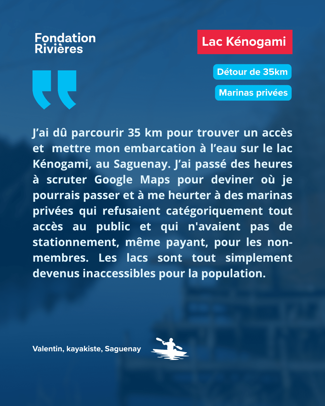 Plus de 98% des rives des rivières et des lacs sont inaccessibles au public, en grande partie à cause de la privatisation croissante des berges. Si nous ne faisons rien, cela risque d’empirer, mais bonne nouvelle : il est encore temps d’agir. D’autres l’ont fait ailleurs dans le monde et on peut très bien appliquer ces solutions chez nous !